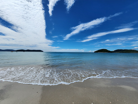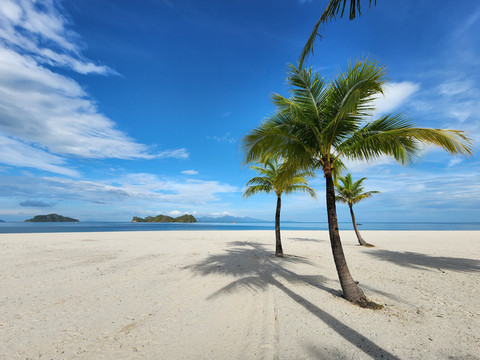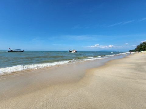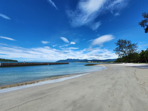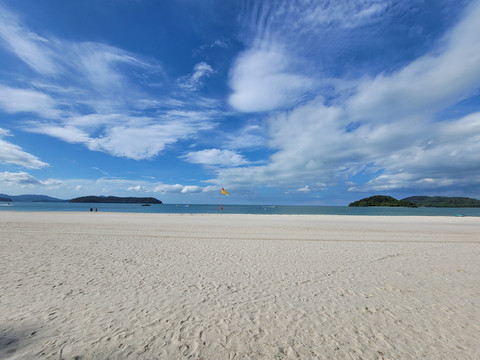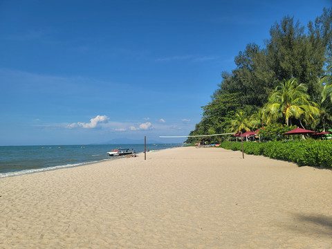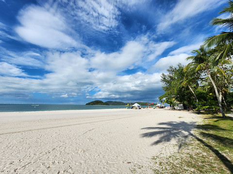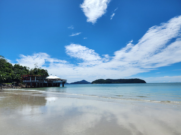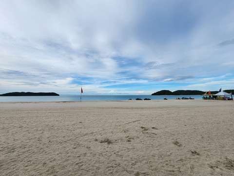 离开之后走走白天的Pantai Cenang,从北到南,一直走在沙滩上,这里的沙含有很多的贝壳,所以并不幼细,如果是赤脚,可能走得还有点艰难,即便是海水漫过的地方,也充斥着贝壳,沙滩上还有很多沙蟹挖出来的小洞,越往南就越密集。海水的质量也一般,下水的游人基本都只是戏水的,浮潜的人很少见,估计因为太多海上活动设施在运作,水的清澈程度一般,还有点蓝绿色。所以我们就只是慢慢地在沙滩上走着,看着戏水玩浪的游人,直到沙滩的最南端。