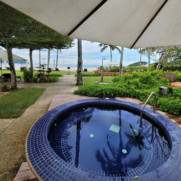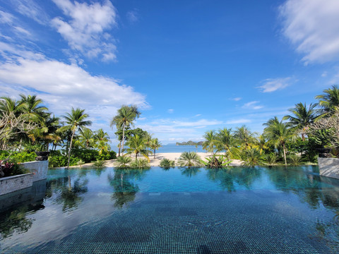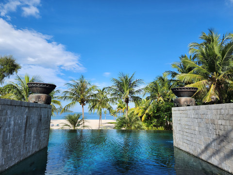 之后前往成人泳池,这里有一个特别的设计,用矮墙间隔了几个区域,每个区域就成为私密的双人世界。两张躺椅,触手可达的泳池,无边泳池外是椰林树影包裹下的大海与沙滩,静静坐在躺椅上,听着泳池喷泉发出的流水声,沐浴着云层背后不算强烈的阳光,很容易就会入眠。 泳池的水算比较清澈,在泳镜下,全长50米的泳道几乎可以看清两端。游泳的,对比使用躺椅的,少很多,几乎每个隐私区域都被使用了,而在泳池中活动的,一直不超过三人。我们也分别游了小半个小时,更多的时间是在半睡半醒间的状态,享受自然的光与风的环抱,流连了近两个小时才舍得离开。