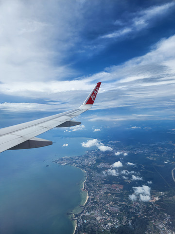 飞去马来西亚陆地一段时间,刚过彭亨附近,因为气流引起的机体震动,引得我们从浅睡中醒来,从窗口往外看,一片白茫茫。然而继续飞近吉隆坡时,云层有所减弱,到达机场附近的马六甲海峡上空,甚至云层都消散露出了阳光,然而这片海似乎没有香港外海的散落的小岛那种浅蓝,而且海峡中除了大型货轮,没有散落的小岛,除了海水就别无所有,一种截然不同的感觉。