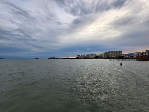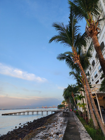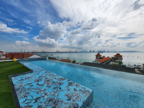 早餐后到酒店顶楼的无边泳池,从这里可以更清楚的看到海,还能眺望到斜拉索跨海大桥Jambatan Pulau Pinang。不过正对面的Penang Port是一个货柜码头,这个面朝大海的景观因此比较失色,也可能因为如此,导致这里的海水都比较浑浊。