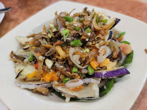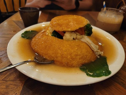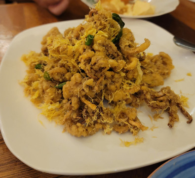 我们在人群中好不容易找了个位置拍个照,就离开前往餐厅了,这里聚集的人实在太多。幸运地在1919 Restaurant KL找到座位,这家娘惹风格的餐厅,一直保持着很高的人气,自然源于其良好的出品。招牌豆腐,上菜时有被惊艳到了,在外皮包裹下的豆腐非常香滑。炸茄子,味道也不错,刚入口有炸薯条的香脆,粉浆内还是可以吃到茄子的味道。苏东就是鱿鱼,奶油脆皮苏东,包裹的粉浆提供了足够的调味,不需要沙爹酱添加味道。京都洋葱鸡,初吃的味道类似京都骨,做法也类似,鸡肉的味道几乎没有了。这里的白咖啡不错,不会太甜导致咖啡本身的味道都失去了。
