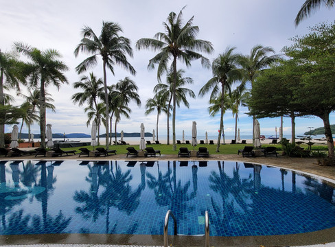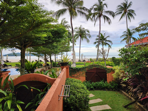 第二天的早上,从落地玻璃往外看就是Pantai Cenang,虽然中间隔着酒店的泳池和草坪,天灰色中略微带一点浅蓝。房间里都能听到外面鸟儿的啼叫,酒店外面的沙滩可以直接走出去,早餐前先踏足一下,这里的沙不算洁白,也不太平整,所以玩海上摩托等各种海上运动的人更多。