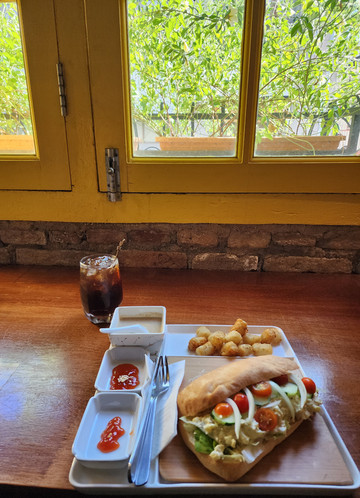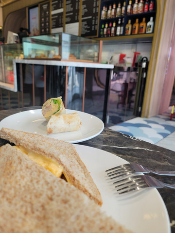 第五天早上起来,从窗外看到海和蓝天,在酒店楼下的San Francisco Coffee简单用完早餐,早上有套餐,食物加饮品有价格优惠,面包和卷饼里面都有卡夫奇妙酱,味道配合得不错。