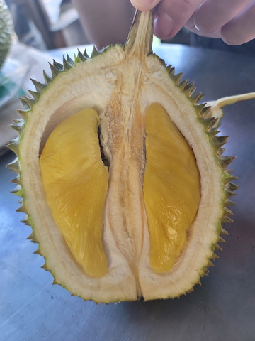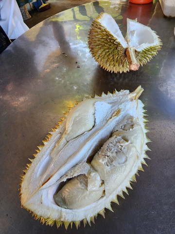 离开的路上,司机推荐了一个相熟的水果摊,让我们在不是槟城榴莲成熟的时节,吃上了两款马来西亚榴莲,我们先试一个马来西亚本土的,果肉颜色比较淡,香味一般,核比较大,但是肉质清甜而且丝滑,再试了一个猫山王,果肉颜色金黄,香气浓郁,展示给自己核薄,肉质甘甜,但是对于我们来说太甜了些。