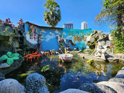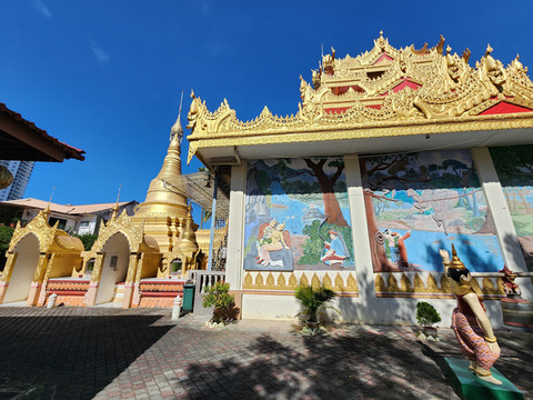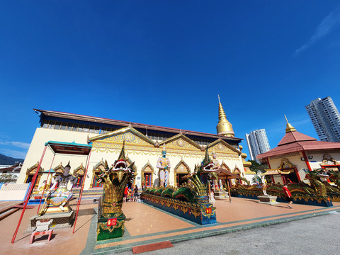 今天天气一直很好,太阳几乎没有躲藏过。今天前往槟岛北海岸滨海地区,出发看海之前,先到Thai Buddhist Temple和Burmese Buddhist Template,这两个都是佛教寺庙,但是泰国和缅甸的风格差异巨大,泰国佛寺相对更加金壁辉煌而且人流更多,不过两个佛寺都有很多的佛经故事图,还有详细的中英文介绍,我们稍微走马观花感受一下。