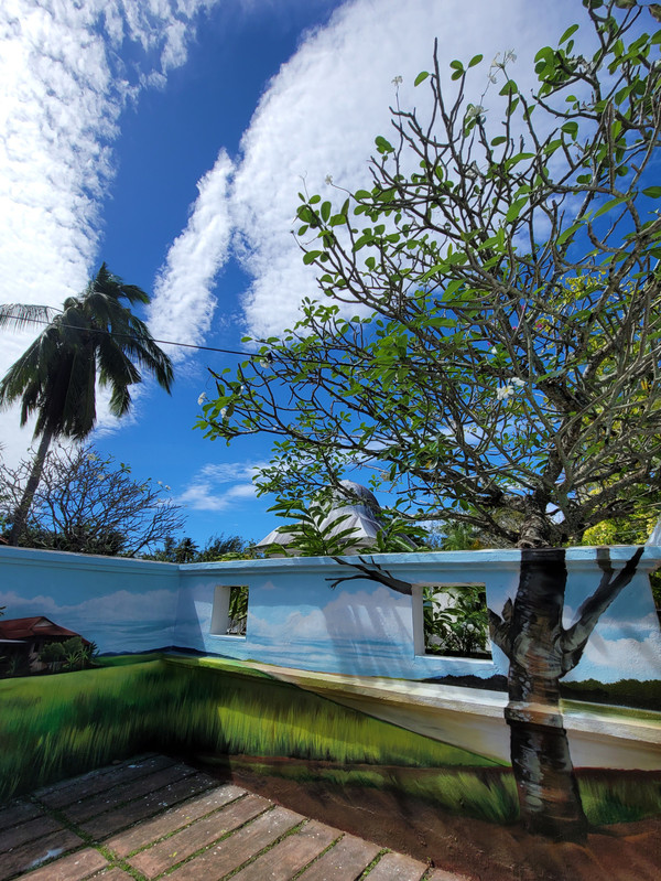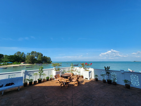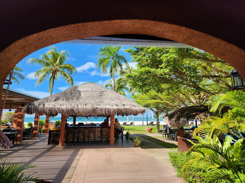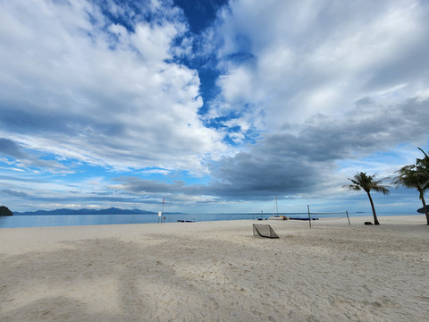 第三天,一早打开窗帘,发现天气竟然如此美好,蓝天飘着朵朵白云,阳光照耀着白色的沙滩,在椰树和建筑造成的光影之间呈现,唯一在海天连接处的一片乌云也在慢慢消散。这样晴好的天气自然将大量来此度假的外国人吸引到各处躺椅之上,而我们则坐在面朝大海的餐厅,享受着海风与风扇形成的空气,喝着冷榨果汁和冰咖啡,看着人来人往,树影婆娑。