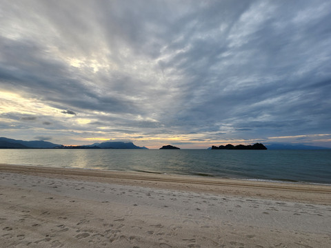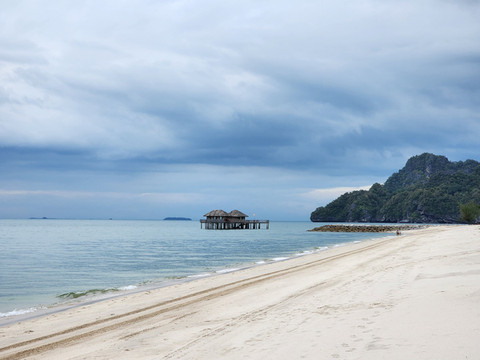 入住手续之后,有员工载着我们对整个度假村的基本设施都走一遍,最后再对房间内设施介绍一边。我们在房间整理停当就开始发掘这座度假村,从我们的房间离主泳池很近,旁边就是酒吧,从酒吧步出沙滩,可惜这时的天色已经完全被乌云覆盖。即便如此,这里的沙也是肉眼可见的比Pantai Cenang的沙细腻和洁白,走起来舒服很多,不过沙滩的坡度较大,虽然这里依旧是公众沙滩,可能因为相对偏远,游人稀少,偶尔才会遇上从房间走出的住客,除了偶然海面上经过的摩托艇,才明了这里也是属于公众的。我们沿着沙滩从酒店中央走到最北部,之后回到树林之中的度假村步道,再走到充满中东特色的入口,这时遇上一位热心的员工,给我们介绍了一些刚刚做导赏的员工遗漏的地方。