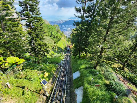 第六天前往Penang Hill,虽然还是工作日,前来的游人已经不少,山脚的缆车站已经有满满当当的游客在等待,缆车票除了一般的单双程,还有普通和快速之分,还可以通过官网网上买票,不过要提前一天,我们之前没留意到,只能现场买票。如果希望有更好的游览体验,还是要买快速票,当你可以通行无阻地进入缆车候车室,就会发现价值所在,普通票要等持快速票的游客上车之后占用了一半,才能开始上车,然而普通票等待的人是十倍以上,这条登山缆车是类似香港的山顶缆车,路轨在大部分位置只有一条,至少十分钟才能有一趟,难怪网上有人说普通票要等两个小时。