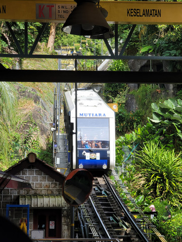 Penang Hill从1788年开始就是当时还是租借槟岛的英国人高官栖身的地方,所以登山的途径一直在更新,从以前用苏门答腊小马到历经两条缆车铁路和四代电缆车系统。现在在用的缆车是2010年彻底更新的,斜度最大达到27.9度,从缆车山脚的站台看上去,已经能感受到这条铁路的坡度。
