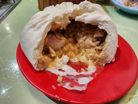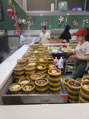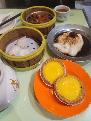 第八天一早起来去试试槟岛的广式茶楼,这里很多茶楼只从早上营业到午后,所以真的是饮早茶。槟岛茶楼有不少,我们选了路经数次的榕槟茶楼,这家拥有40年历史的,2021年才迁到Lebuh Kimberley的一间老房子,内部看起来还很新,装修风格有点像旧式香港茶餐厅,所有点心还是要顾客在店铺中央的柜台现点现取,不是现在流行的现点现做的方式,看到一个个迭起来的蒸笼和里面的各式点心,似乎会勾起人们更大的食欲,我们就点了好多款点心,想尽可能尝试不同款式。鲜虾肠粉的粉浆一般,沾性较高,不过搭配上XO酱,却有一种独特的体验。虾饺皮不算爽口,不过虾仁是清爽的。凤爪味道没有被酱汁盖过,保持广式点心的口感。蛋挞的酥皮有点太焦了,以至于吃起来有略微焦苦味。烧卖,保持传统,只用猪肉和虾子,没有现在各种添加,保留了猪肉馅带出来的甜味。芋泥酥算是比较少有的点心,而且内馅并不是完全是芋泥,里面还是有一些芋头粒的。大包是最惊喜的,鸡肉内馅将鸡汁完全融入了蒸包表皮之中。另外这里的茶也不错,菊普可以感受到两者带来各自的香气和味道,普洱茶可以看到碎茶叶而不是很多广式茶楼为了控制成本采用的茶叶梗。我们停留了大概一个半小时,基本没有空闲的桌子,顾客也并非都是游客。