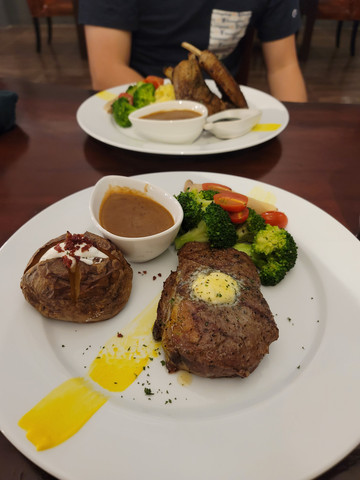 看罢晚霞,我们继续沿着沙滩向南前行,经过Cenang Mall之后,到达Mafioso Steakhouse尝试一下在兰卡威的扒餐,感觉上做扒餐的厨师还是有水平的,羊架做得不差,搭配蘑菇汁和香草酱汁,更调口感。西冷似乎受限于牛肉本身的质量,没有做出能太好的突出牛扒口感。