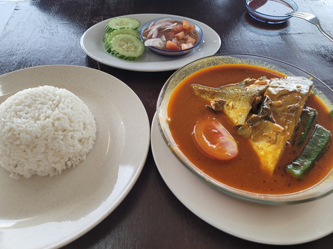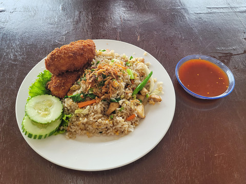 Check out后的时光,我们沿着Tanjung Rhu向南走出了度假村的范围,来到公众沙滩区域尝试了一下街边小店的味道。价格实惠,味道也不差,咖哩煮鱼的味道不错,鱼肉鲜嫩,咖哩汁拌饭很容易就吃下不少;炸鸡略微过熟,但是粉浆里面的鸡肉还控制得比较好,配上有鸡肉粒的炒饭也算可口,配备的酸甜辣酱,入口时没什么辣味,但是后劲不弱。