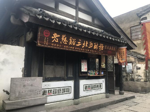沿着湖边往里走,左边有个广场,边上有座传统的戏台,右边就是古街了。古街两边是各色店面,有慈溪年糕饺、糟鸡、三北豆酥糖等。听说有种老鼠糖球,便买来品尝,虽没有期待的那种造型和口感,但麦芽糖的味道确也十足的浓郁。小巷里不时地有游客从我身边擦肩而过,在这里随意走着,我们不用担心迷路,也不用担心小巷的尽头是什么,看到古宅了,便进去逛一下,仿佛回到了年少的时光和无忧无虑的日子。再回首,当初的少年郎已经长成了大人模样。