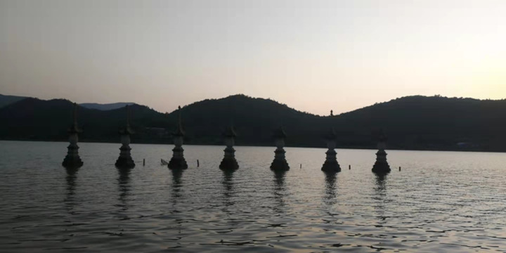 下了车,我们首先注意到的是湖边的金仙寺。据说这座寺庙始建于南朝梁大同年间,属于“南朝四百八十寺”之一。可能是因为防疫的原因,寺庙未对外开放。寺庙正门前的白洋湖中,有七座建于水中的石塔,类似于杭州西湖中“三潭映月”的石塔,颇具特色。晚清诗人姚燮为此还曾写下了“空水了无翳,天色浮之莹。一碧曳山远,薄岚含渐暝”的诗句。