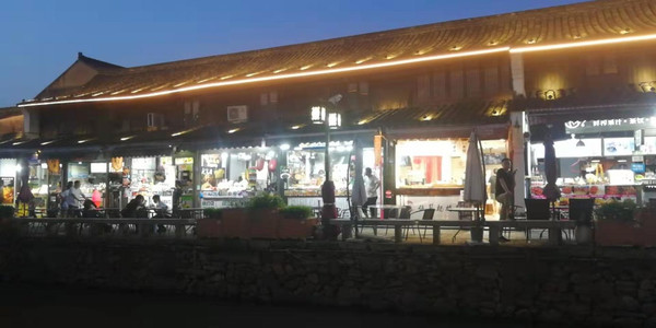 走过国医馆,便是美食区。一边是各种美食夜宵店,一边是古宅民宿,形成了安静、热闹两种风格。河面倒映着灯光,偶尔还看到几个穿着汉服的小清新在这里取景,或直播或拍摄或留影。夜幕降临,灯火通明,月儿高高挂着,此时此刻,我坐在河边的长廊里,吹着微微暖风,好似在喧嚣中寻得了一处心灵的静处。