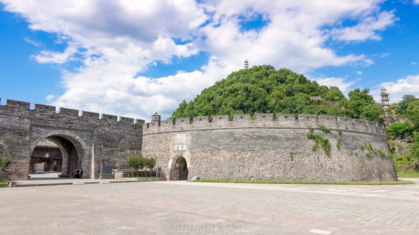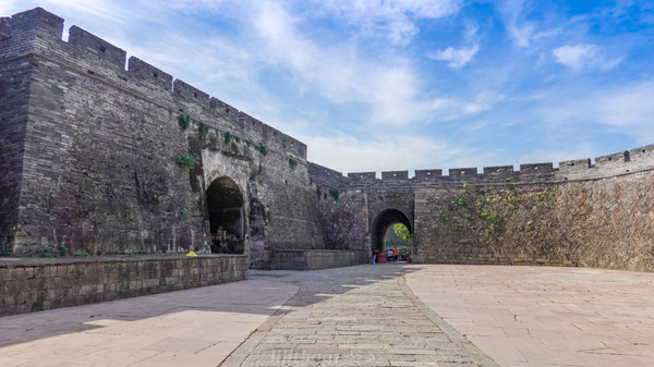 长城依着清山蜿蜒而进,全长6000多米,现存5000米。东起揽胜门, 沿北固山山脊逶迤至烟霞阁,于山岩陡峭间直抵灵江东 岸,延伸至巾山西麓,依山就势,俯视大江,矫若巨龙,雄伟 壮观,尤以北部最峻,与北京八达岭长城形神俱肖,人称 “江南八达岭”。