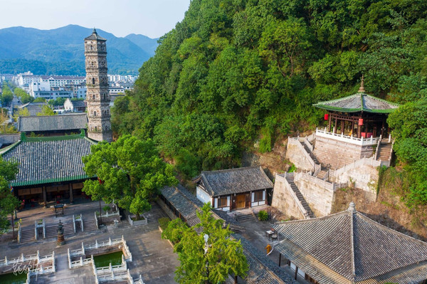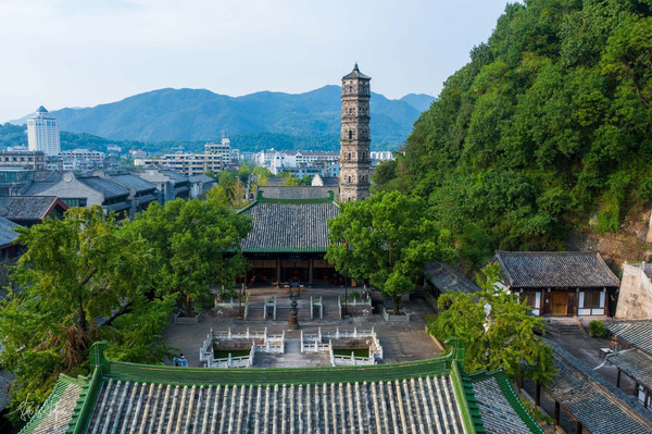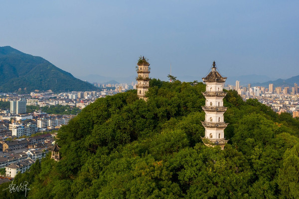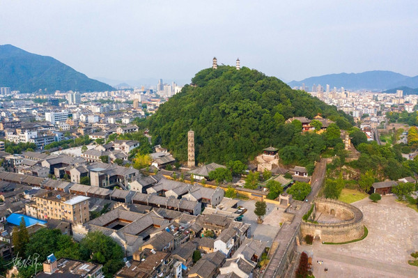巾山高不过百米,三面临街,南边是护城河灵江。一山有四塔,山顶上的两座大小双塔称为“文峰塔”,山脚下还有南山殿塔和千佛塔。这几个塔的年代都是很久远的了,特别是千佛塔,它是砖木混合结构的阁楼式建筑,很罕见。