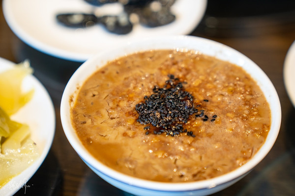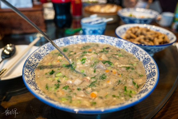 糟羹看着真的是其貌不扬,我们点的这一碗是咸羹,主食是颗粒状的芋头、里面还有许多蔬菜,肉类和粉条也有一些,吃起来挺鲜美的。据说糟羹是当年戚继光在抗倭筑城的时候,那会儿食物比较匮乏,老百姓们拿出家里仅有的食物出来煮给将士们吃,这家拿芋头,那家拿芥菜,东南 西北 拿出来的都不一样,香菇、豆腐……切成丁一块煮了加入淀粉浆,就成了今天的糟羹, 临海 人每年正月十四都会吃糟羹。