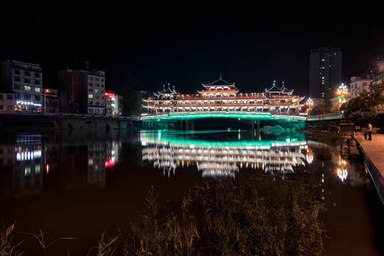 廊桥横跨整个岚河,是一个集合商业购物和美食的4层楼的仿古建筑,整个岚皋的商业区是以它为中心,向各个方向延伸。