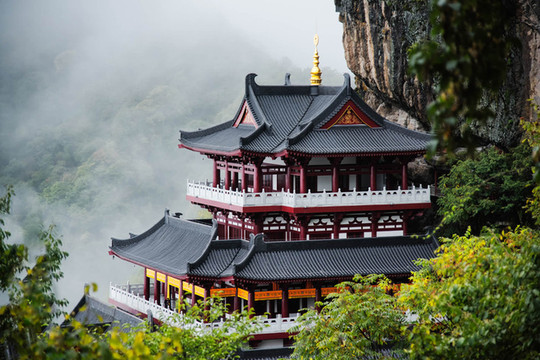穿过石门,到了真身殿。顾名思义,真身殿供奉的是一代高僧弘一大师的真身。真身殿前的寺院正在修补,从后面的小路穿过,穿过这段,峰回路转,周身瞬间烟雾缭绕,走到大殿前,大雾又一扫而空,真是来也匆匆去也匆匆的震撼。