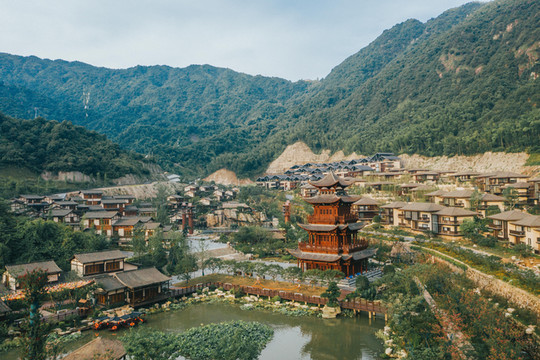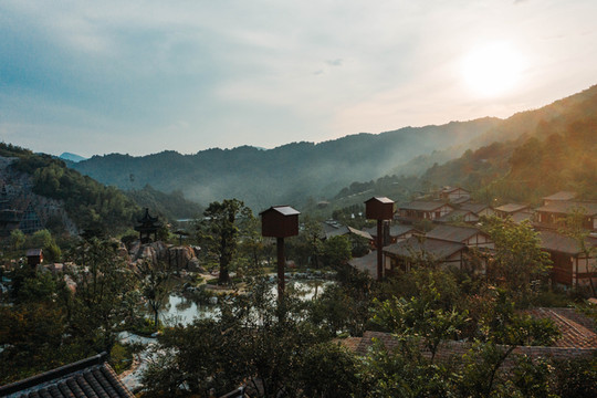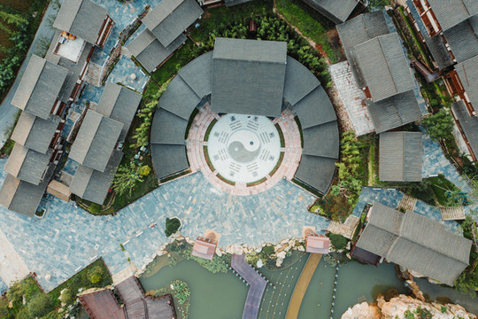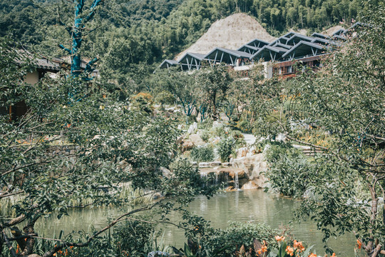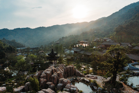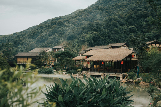 枕山宿特色酒店位于仙村最高处依山而筑,伴水而起,仿古的顶棚建筑像座小型山脊,连成一片的酒店与山水更相融。航拍更出效果啊!