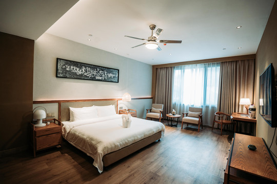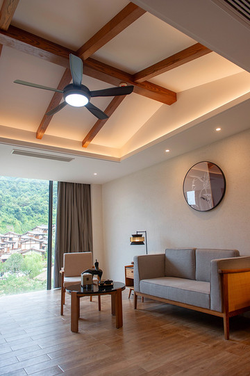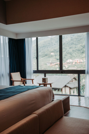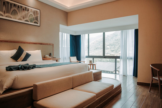 客房和卧室是独立分开的,半套房设计,大落地窗外可以看整个葛仙村度假区,房间也非常适合带孩子一起,至少空间上够孩子来回走动的。