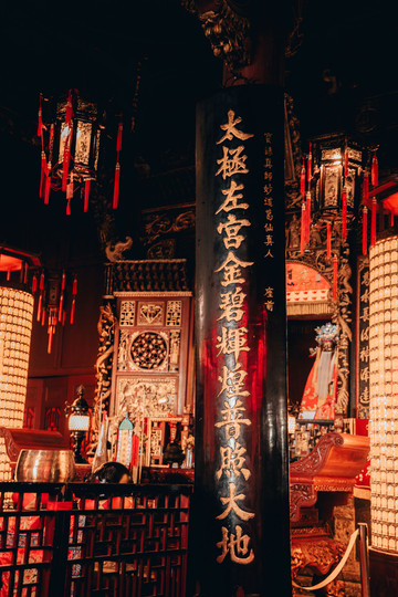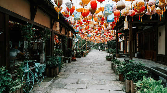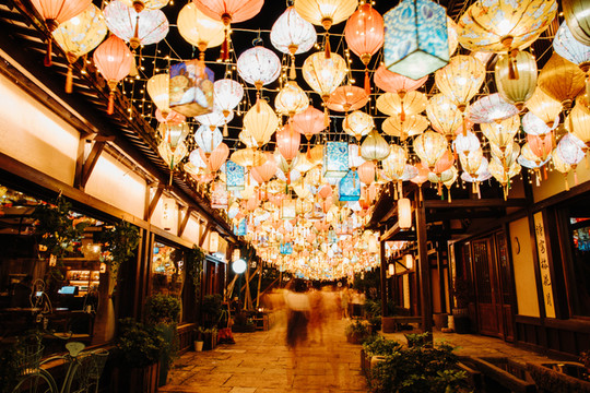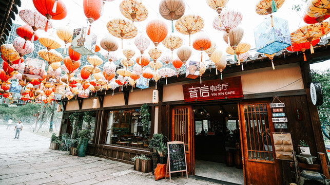在景区逛累了,可以来邻近众妙阁的这间音信咖啡厅坐坐小惬一会。咖啡厅门前的街道上挂满了各式各样的灯笼,店内店外都布置的很有感觉。