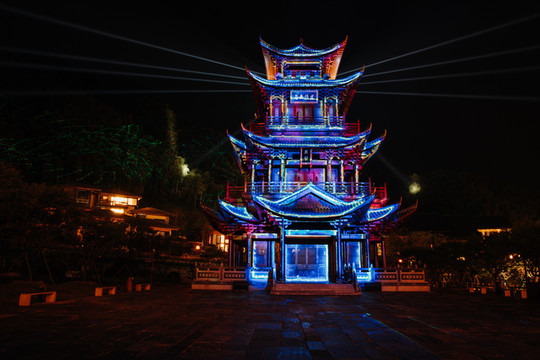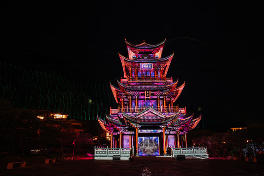 石崖制高点,它名为临官崖,夜晚在光影秀的映射下,呈现出多姿多彩的形态。