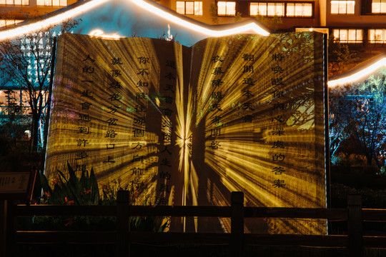 这本巨大的书就是夜游景点之一天书,天书二字诞生于太昊时期。《简易道德经》里所述:"人献河洛,问何物,昊曰天书。"