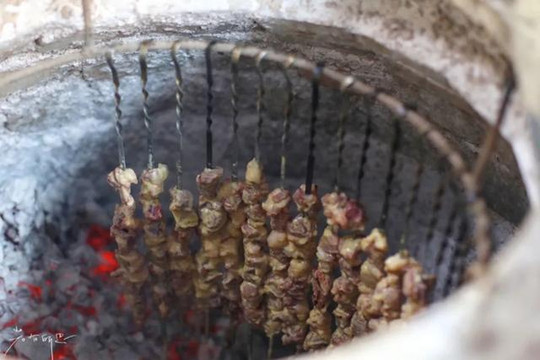 这是烤羊肉串,一串串倒挂在馕坑里,碳火慢烤,满屋子的香味。