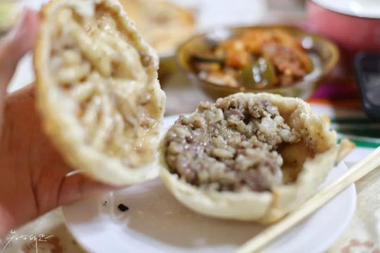 打开来,里面是满满的羊肉。外壳酥脆,里面的羊肉鲜嫩,而且一点都没有膻味。事实上在新疆,所有吃的羊肉都没有膻味。