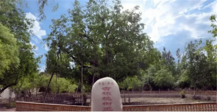 有着1300多年的核桃王位于和田城西南巴格其镇。核桃树王占地约一亩天地,树高16.7米,树冠直径20.6米,树型大致呈“Y”字型,整个大树主干五人合抱围而有余。由于年代久远,主树干中间已空,形成一个上下连通的“仙人洞”,洞底可容四人站立。树王似乎吸收了天地之精华,产生了天地之灵气,历经千年沧桑,仍然高大伟岸、枝繁叶茂、苍劲挺拔。
