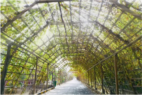 葱绿茁壮而又生机勃勃的葡萄长廊绵延千里,蔚为壮观,徜徉其间,脚下是乡间小路,头顶翡翠般的葡萄,一派田园景色,使人犹入仙境、流连忘返。