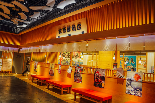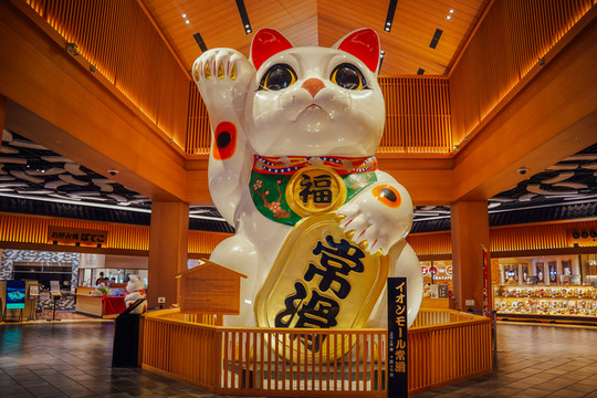 这里的建筑造型十分复古,大大的日式灯笼招牌格外醒目。不过最引人注目的还是位于大堂中央这只巨大的招财猫——多福。