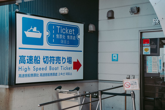 从中部国际机场前往鸟羽推荐乘坐高速船,按照指示标志乘坐扶梯出航站楼后,就能看到连接乘船处的通道以及高速船售票处标识,直接购票乘船,非常便捷,自由行毫无压力。