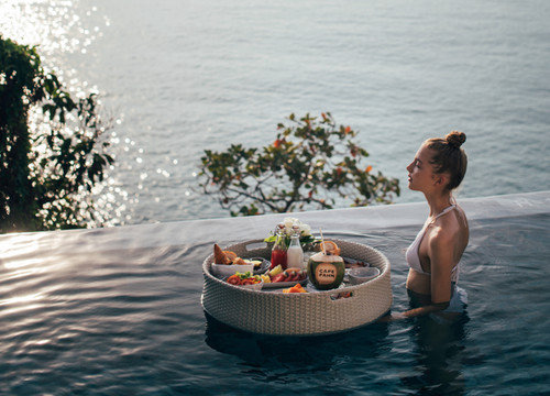 早晨,躺在床上拉开窗帘就可以看日出,将大海收进眼底的瞬间,纵使有一千万吨起床气,也会被窗外的美景融化了。房间里的无边泳池让人心情愉悦,仿佛延伸到大海之中的泳池,碧海蓝天的壮美倒映在泳池平静的水面上,似乎游着游着就能游到大海里。