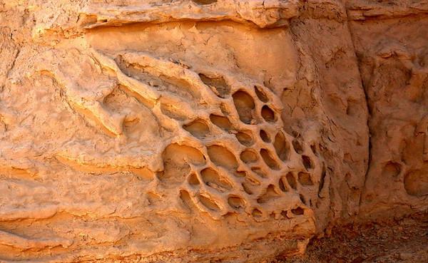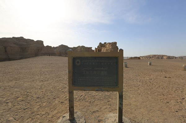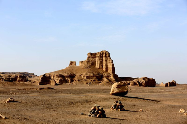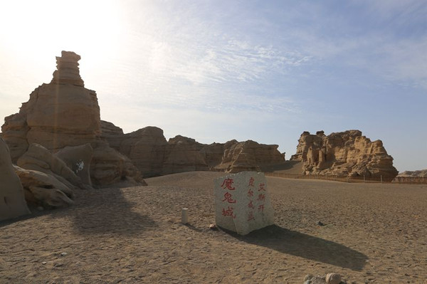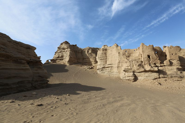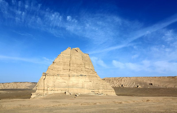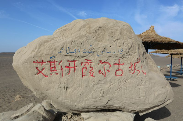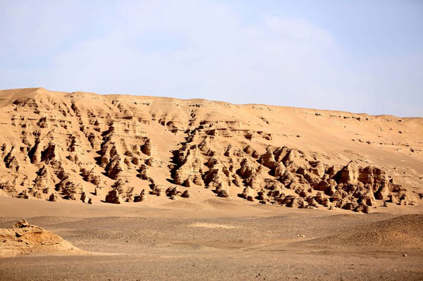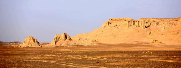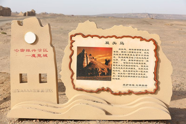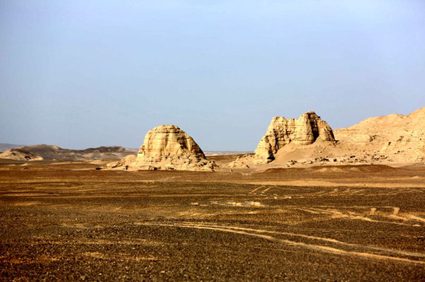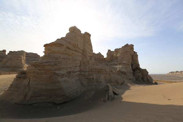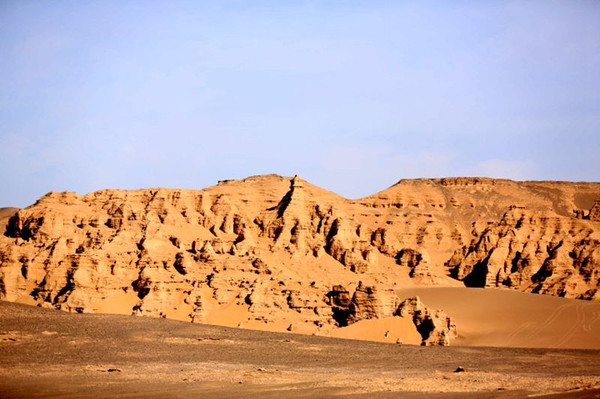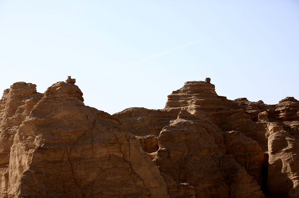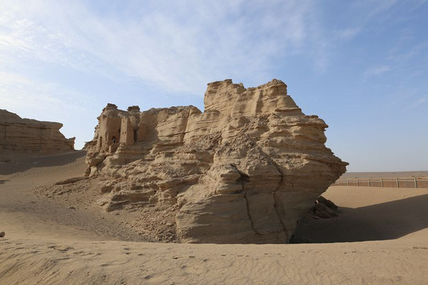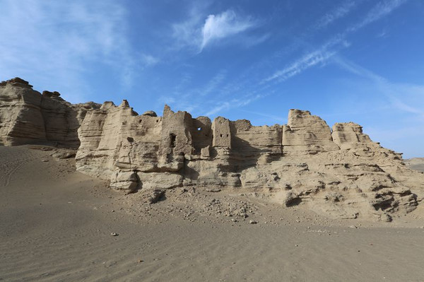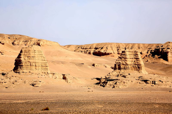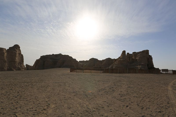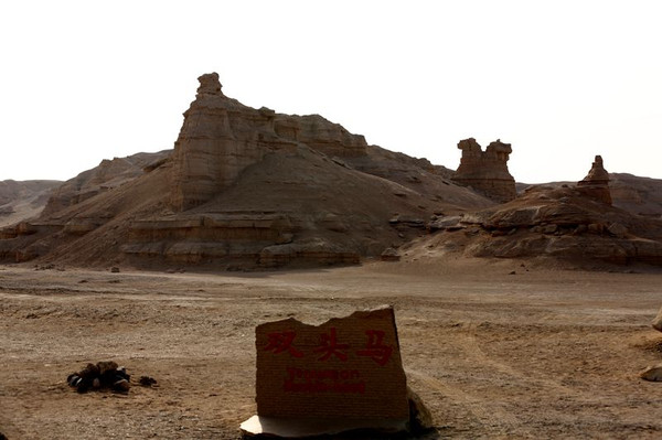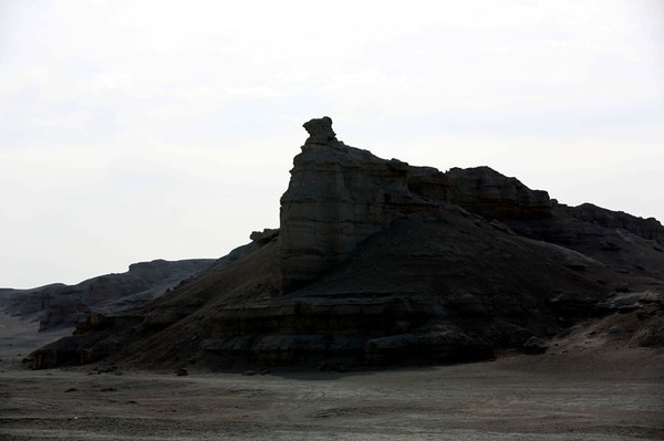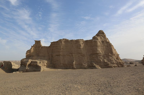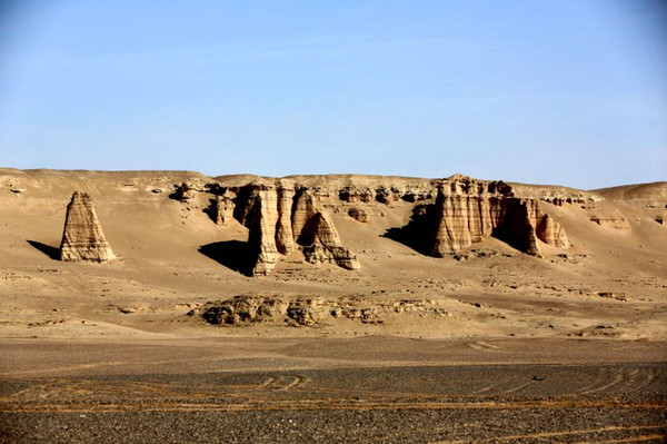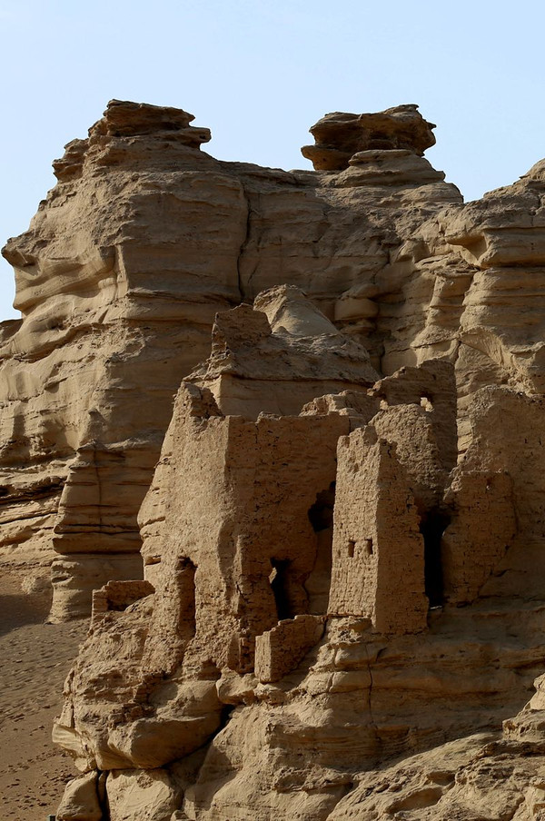 离开双头马 不远,有个服务区,服务区对面是魔鬼城中的古民房遗址,艾斯克霞尔古城堡,在离地面约六米的风蚀台上建有两座长方形的土夯建筑,高约有五米,前面有门有窗,这就是人类活动之地,估计应当是古丝绸之路的驿站或是哈密王朝的西南哨所。据当地人推测,此地西面的沙尔湖(由流沙通向罗布泊)干涸之前,这里也有村庄人家,当水源游移沙尔湖消失后,林木飞鸟在风沙中,部分变为化石,而此地居住的人只得背井离乡,连先祖的遗骨也移走了、至今仅有遗址了。