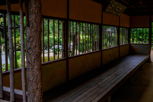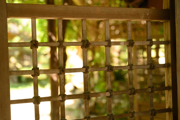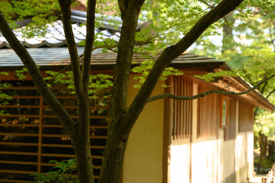 南庭的茶屋掬月亭方正端庄,靠近北庭之处的茶屋“日暮亭”则是茅草屋顶的草庵,屋前的两棵松树,被阳光无遮无拦的滋养,茁壮生动,正午阳光透过浓密的松针,照在草庵的竹桓上,昏黄懒散。