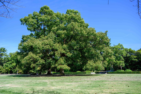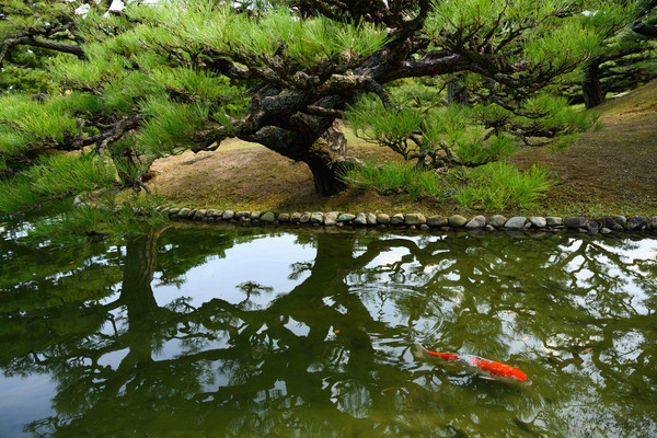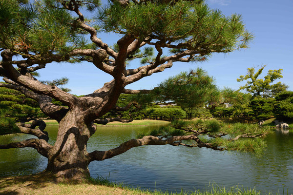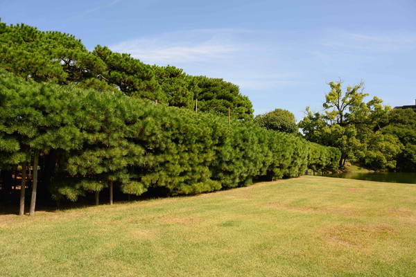 游罢南湖,步行北庭,南北两庭,一娴雅一野逸,就算是栽种的植被也有所不同。栗林园遍植松树,约有1400株,其中1000株定时有园艺匠人精心修建。南庭著名的“箱松”,200余株松树,经过300多年的驯养修剪,不可思议的形成“门”字形状,所有的松针向外生长,内向成为一个方箱形状,而横看则是一排屏风的样子。与流水矮松锦鲤的南庭不一样,北庭少有“泯灭树性”的盆景植被,更多的是自由生长的形态,大片的草坪,粗壮直入天际的独木。