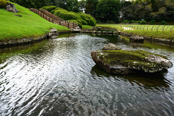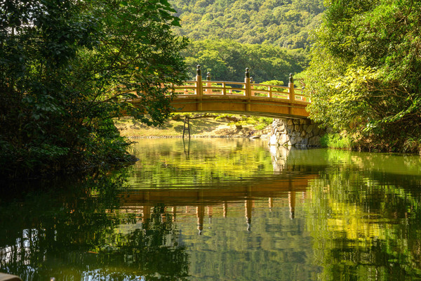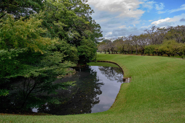 走出冈山城城守,通过一座铁桥,就能进入后乐园,就像站在冈山城守上远眺的感觉,这是一个占地颇广的园子。近观的第一印象,有种“阡陌交通,鸡犬相闻”的奇妙感觉,一片广袤的草坪,大小不一的池水湖面分布期间,极似乡间的耕地田梗。后乐园总面积144000㎡,草坪面积就有19000㎡,而这些草坪原来真的是三代藩主刻意种植的水稻,日出而作日落而息的田园生活对于一藩之主而言,也只能是念之不得的情结。