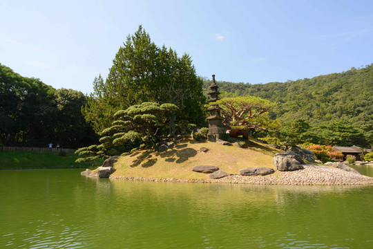 栗林园背靠紫云山,原来是一片栗子林,日本战国时代当地的富豪佐藤氏在紫云山东麓修筑私人庭院,1625年江户时代生驹氏入封赞岐高松籓开始建造南湖,之后历经数代籓主前后花费100多年时间建造出这座江户初期洄游式“大名庭园”(后乐园也是洄游式庭园)。