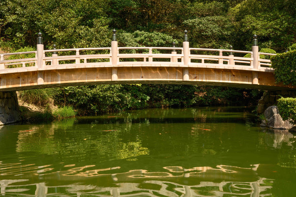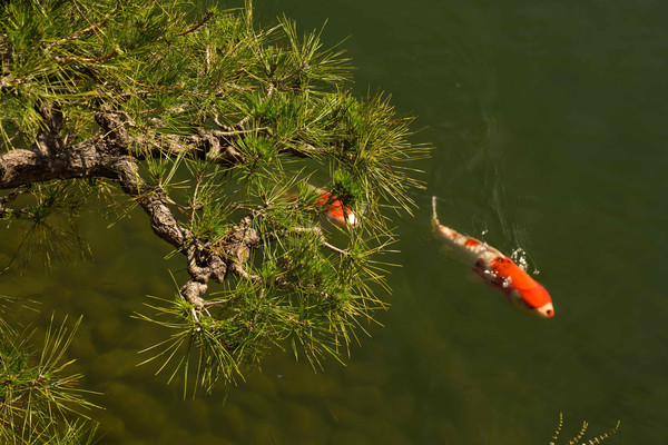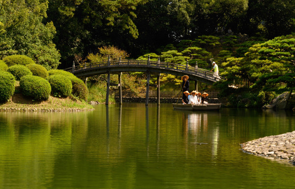 小船轻轻划过碧绿凝脂,缓缓滑过偃月桥倒映水中的完美半弧。漂浮在湖面上巴掌大的小岛上,有石灯幢和佛塔,居然还是能够登岛拜祭的。好似片片浮云修剪成型的松树,浑圆似心形的杜鹃花丛,固守在自己的飘浮之地上,盈盈不语。叫做“蓬莱”的三块小小仙石,形单影只的守在湖中央,也许成仙不易成了仙也不易吧。对面相向而来一艘小船,我们的小船,他们的小船,无声无息,舟边是旁若无人畅游的五色锦鲤,本来我们才是这个巨大盆景里的过客,这些锦鲤才是这南湖的主人。湖中央的茶屋名曰“掬月亭”,没有了藩主的“掬水月在手,弄花香满衣”,正有身着无垢白衣的新娘,在家人的祝福声中,与新郎正襟危坐。