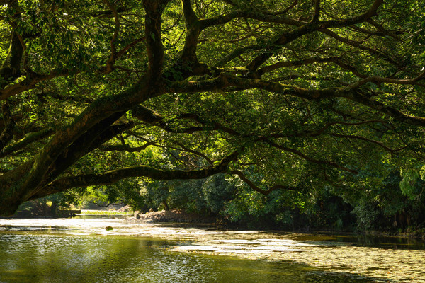 越往北庭深处,野趣愈浓。时而出现一条登山石径,跃步登上,真有小小一览众山小之感。时而出现一大片荷塘,已近初秋,荷花不再,但可见盛夏之时的接天莲叶无穷碧。时而出现一整片石壁,名曰赤壁,上有片片松树恣意自在居高临下,瀑布水流不大,但却深得自然之趣,赤壁之下的湖水名曰“西湖”,说是湖,其实更像是一弯山林之间的河流,阳光透过两边密密的树叶,星星点点在湖面上闪烁。
