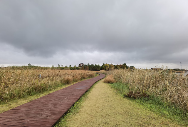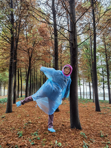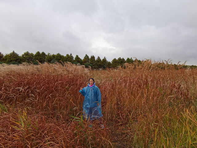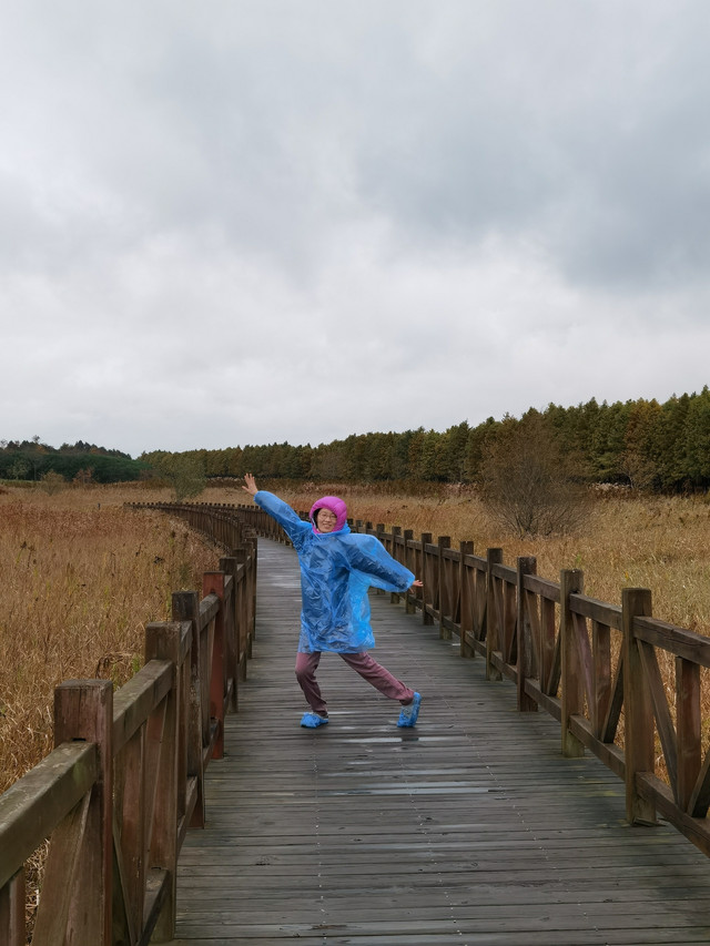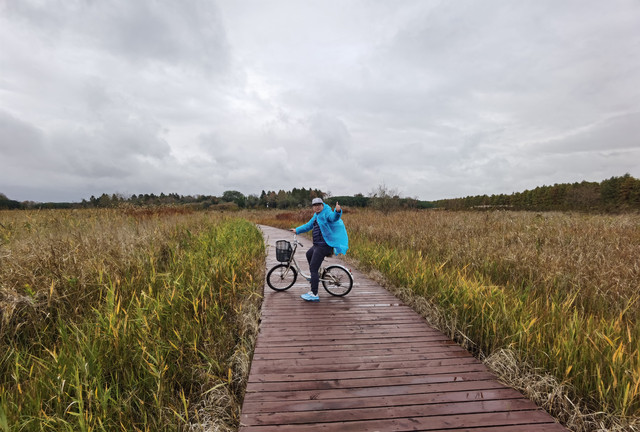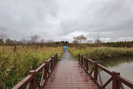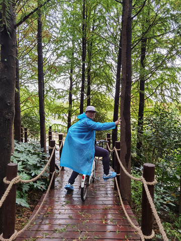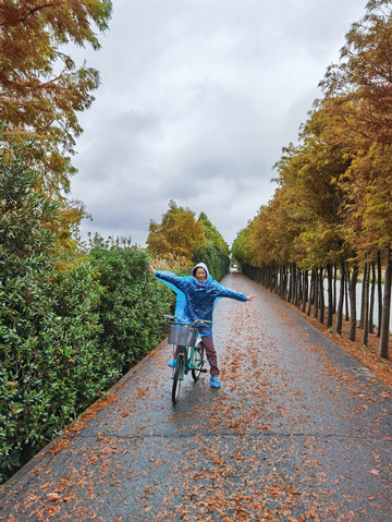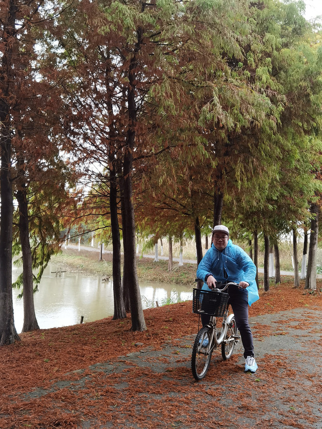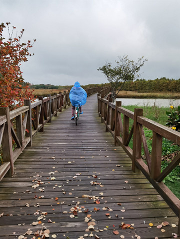 看着外面天气还算过得去,决定开车去东滩湿地公园,原以为不要门票的,到了之后才发现要80一人,而且网络上没办法买当日票,老公说来都来了就进去看看吧,由于靠近海边,风实在太大了,还下着蒙蒙细雨,所以把能穿的衣服都套上,再穿上雨披。进去一看,公园望不到尽头,电瓶车开走了,要等很久,靠11路走是完全不可能的,只能租自行车骑行,由于雨天,我们没有租双人的,每人租一辆24寸的,20元/2小时每辆。