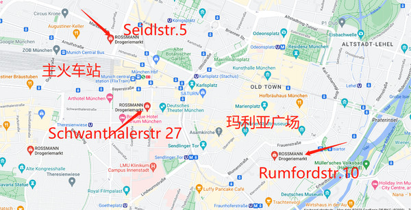 Seidlstr.5号和Schwanthalerstr 27号分别在慕尼黑主火车站北广场和南广场上。玛利亚广场南边的这间ROSSMANN店铺在前往德国国家博物馆Deutsches Museum的路上,地址是Rumfordstr.10号都是步行距离,大家可以一边欣赏城市,一边把要买的小礼物都买上。