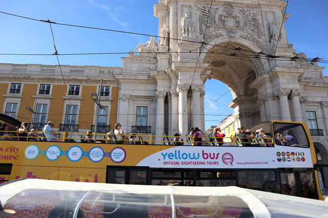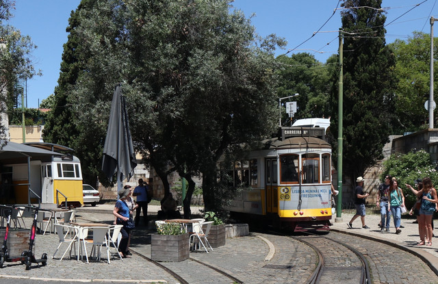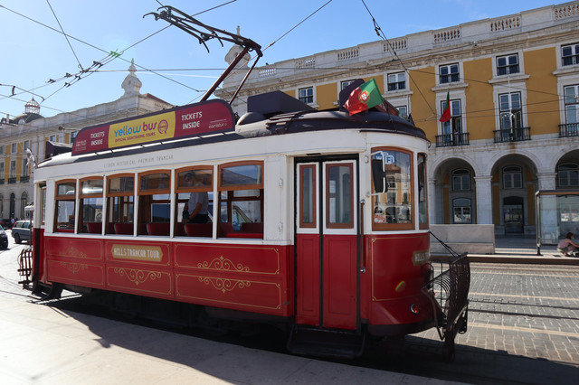 驶过一辆老式有轨电车,探索里斯本及其历史街区的最佳方式之一是搭乘28路有轨电车,明黄色的木制车厢,沿东西方向穿过里斯本老城最有特点的区域,从高低起伏的窄小街巷中走过,全程下来一个多小时,极富情趣。可惜无缘了。