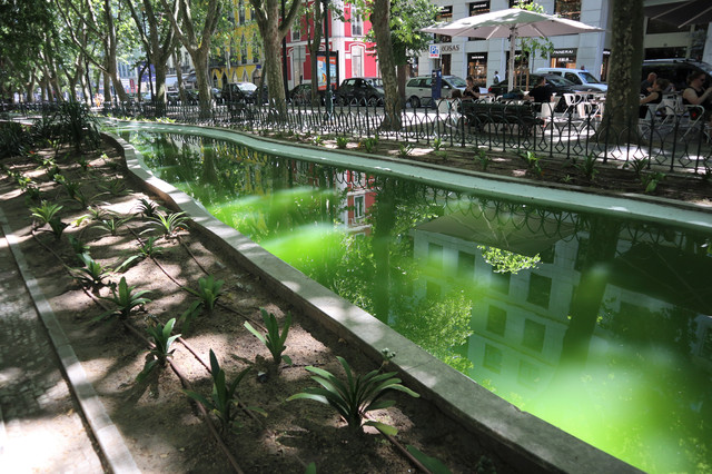 行走在林荫道下感觉舒适,暑热顿消,树荫下有供人休息的靠背椅,花园里有喷泉、瀑布和流水,还有一些精美的雕刻和纪念碑。