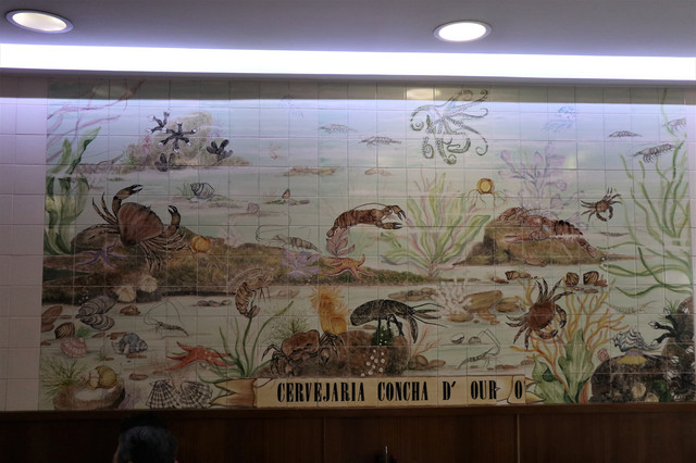 瓷砖壁画也紧扣本店主题,鱼、虾、蟹、贝之类应有尽有,一幅海洋世界百俊图。