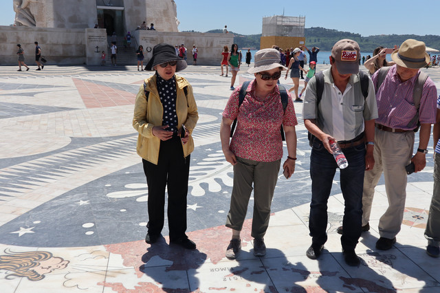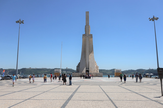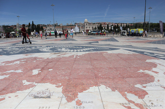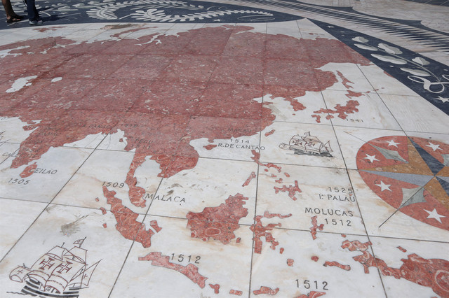 航海纪念碑广场,地面上刻有一幅世界地图,上面有发现新大陆的日期,并标出了葡萄牙航海家远航世界各地的年代、地点和航线,展示了当年葡萄牙辉煌的航海史。