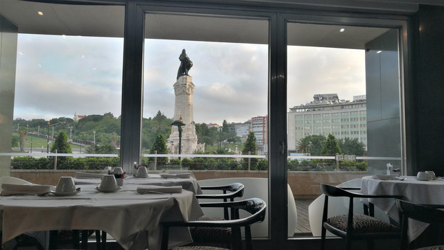 游游逛逛,走马观花,游览过里斯本的几个主要景点,已是下午14点半,尽管在百年老店吃了蛋挞,但饥饿感隐隐袭来。而且几个钟点下来,走的腿脚乏力,需要休息。导游早已选定市中心的一家餐厅,说是距我们下榻酒店不很远。车行十余分钟,拐入里斯本著名的自由大道,车中拍下一张庞巴尔侯爵广场照片。